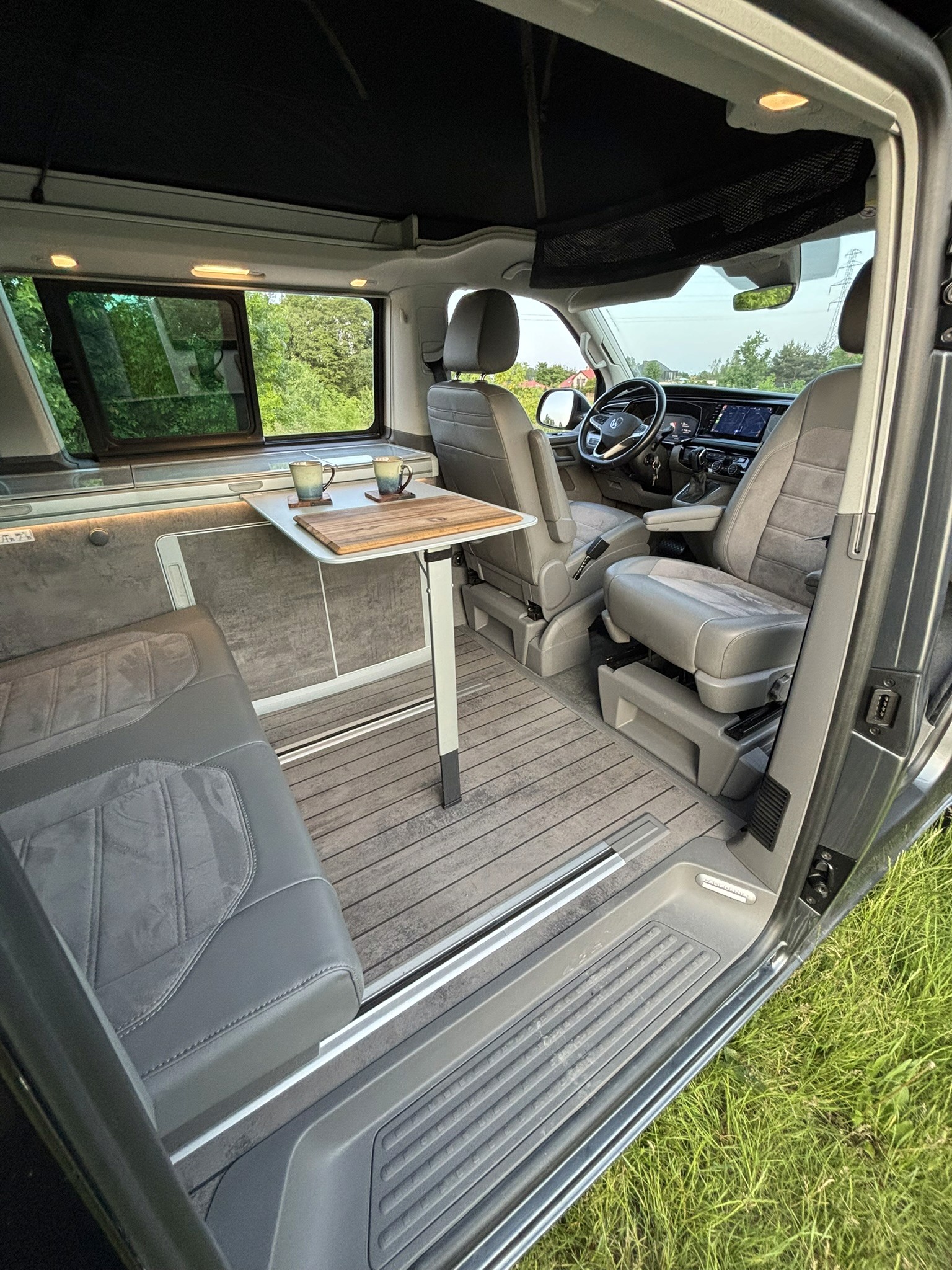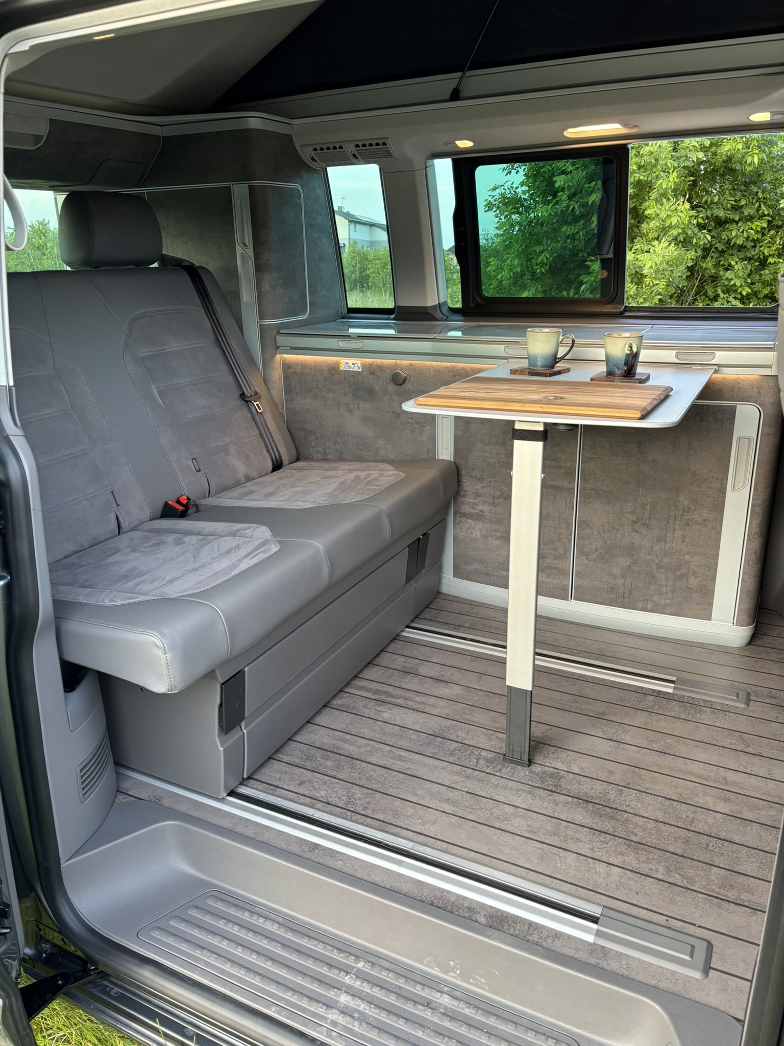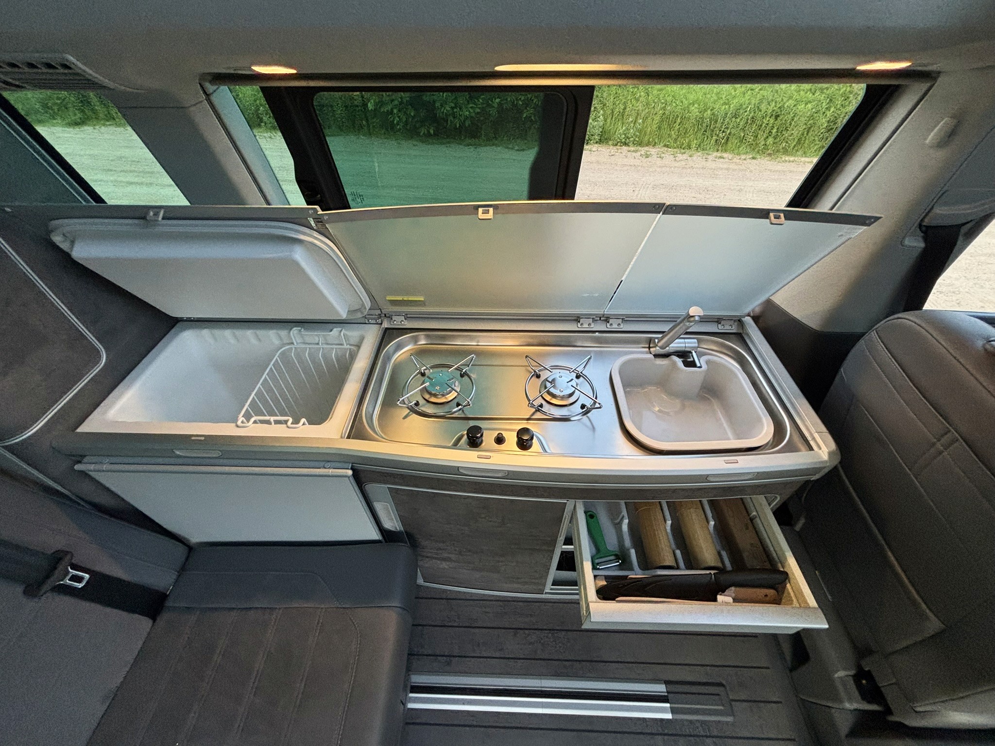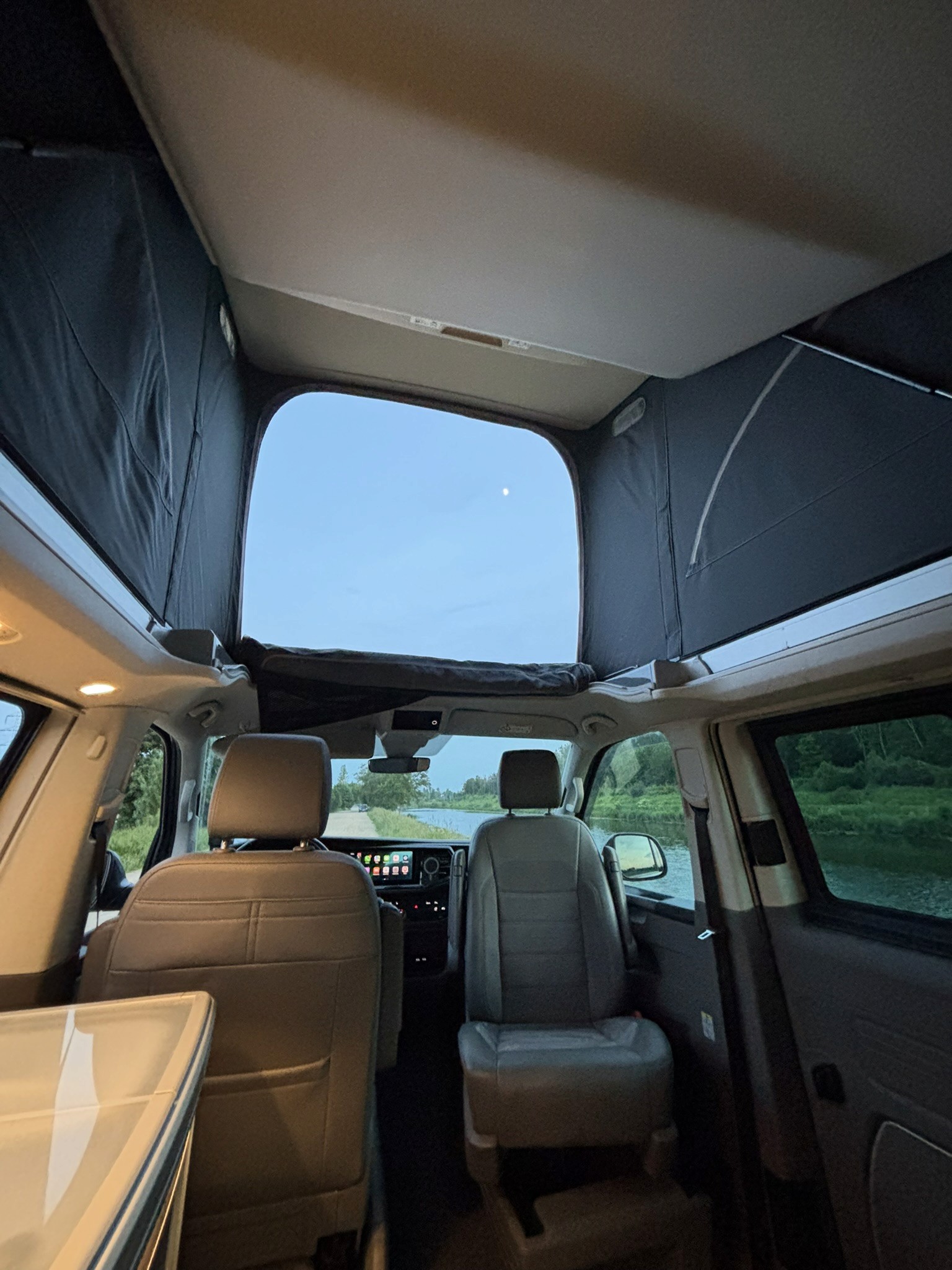 Wnętrze kampervana zostało zaprojektowane z myślą o maksymalnej wygodzie na niewielkiej powierzchni. Znajdziesz tu przestronny wysuwany dach z łóżkiem (2m x 1,2m), składane tylne siedzenie zamieniające się w drugie dwuosobowe łóżko (2m x 1,2m) oraz w pełni wyposażoną kuchnię i mnóstwo akcesoriów kempingowych: