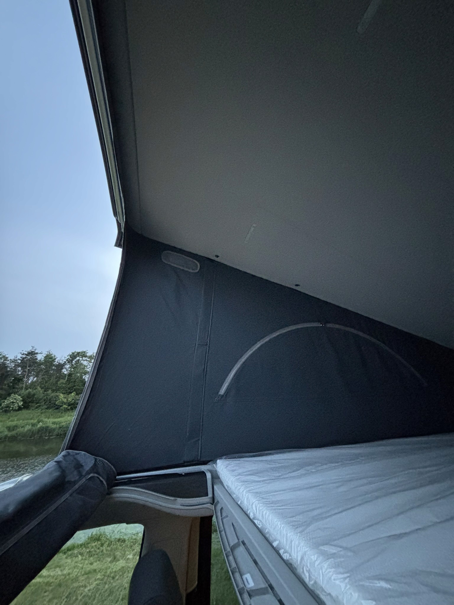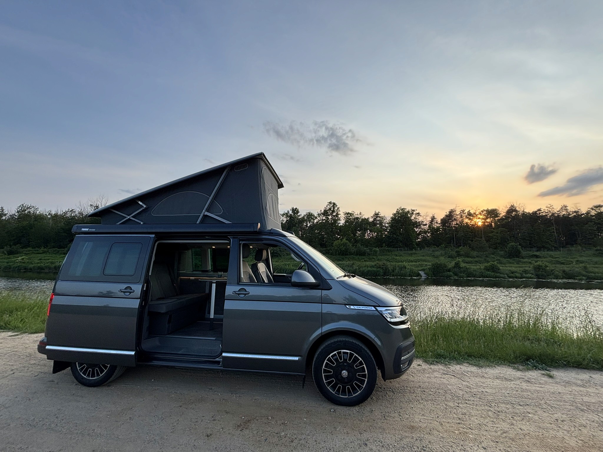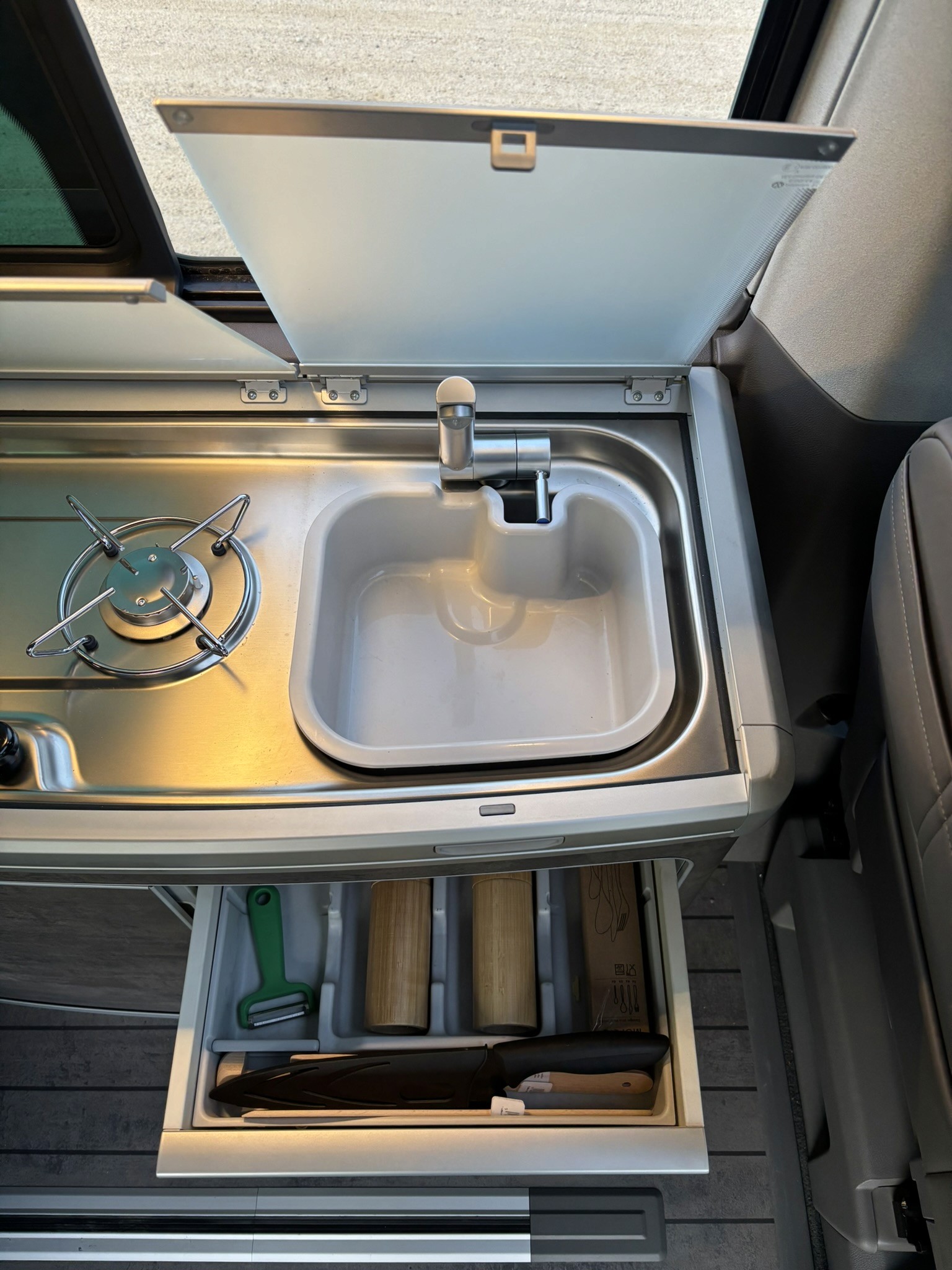 Wnętrze kampervana zostało zaprojektowane z myślą o maksymalnej wygodzie na niewielkiej powierzchni. Znajdziesz tu przestronny wysuwany dach z łóżkiem (2m x 1,2m), składane tylne siedzenie zamieniające się w drugie dwuosobowe łóżko (2m x 1,2m) oraz w pełni wyposażoną kuchnię i mnóstwo akcesoriów kempingowych: