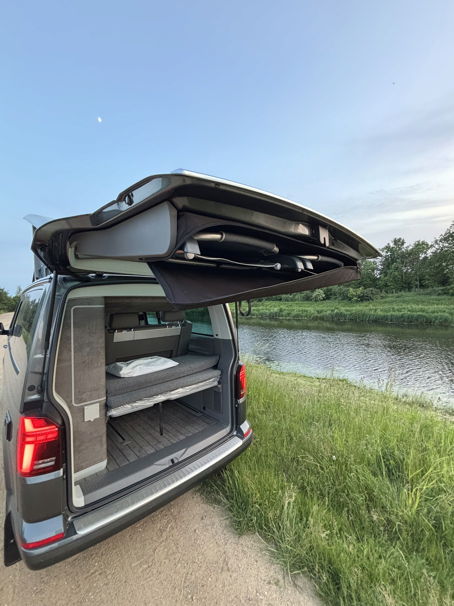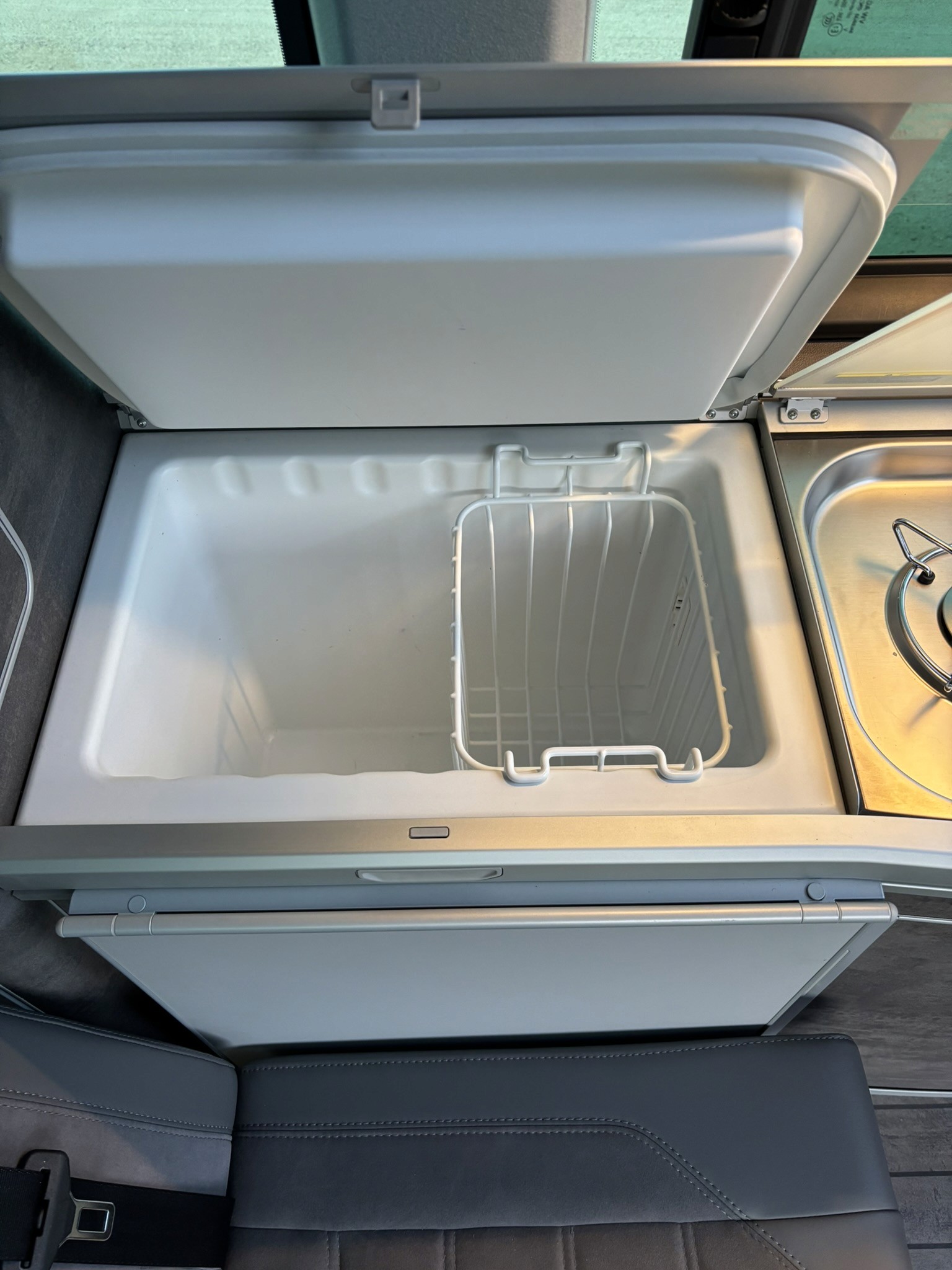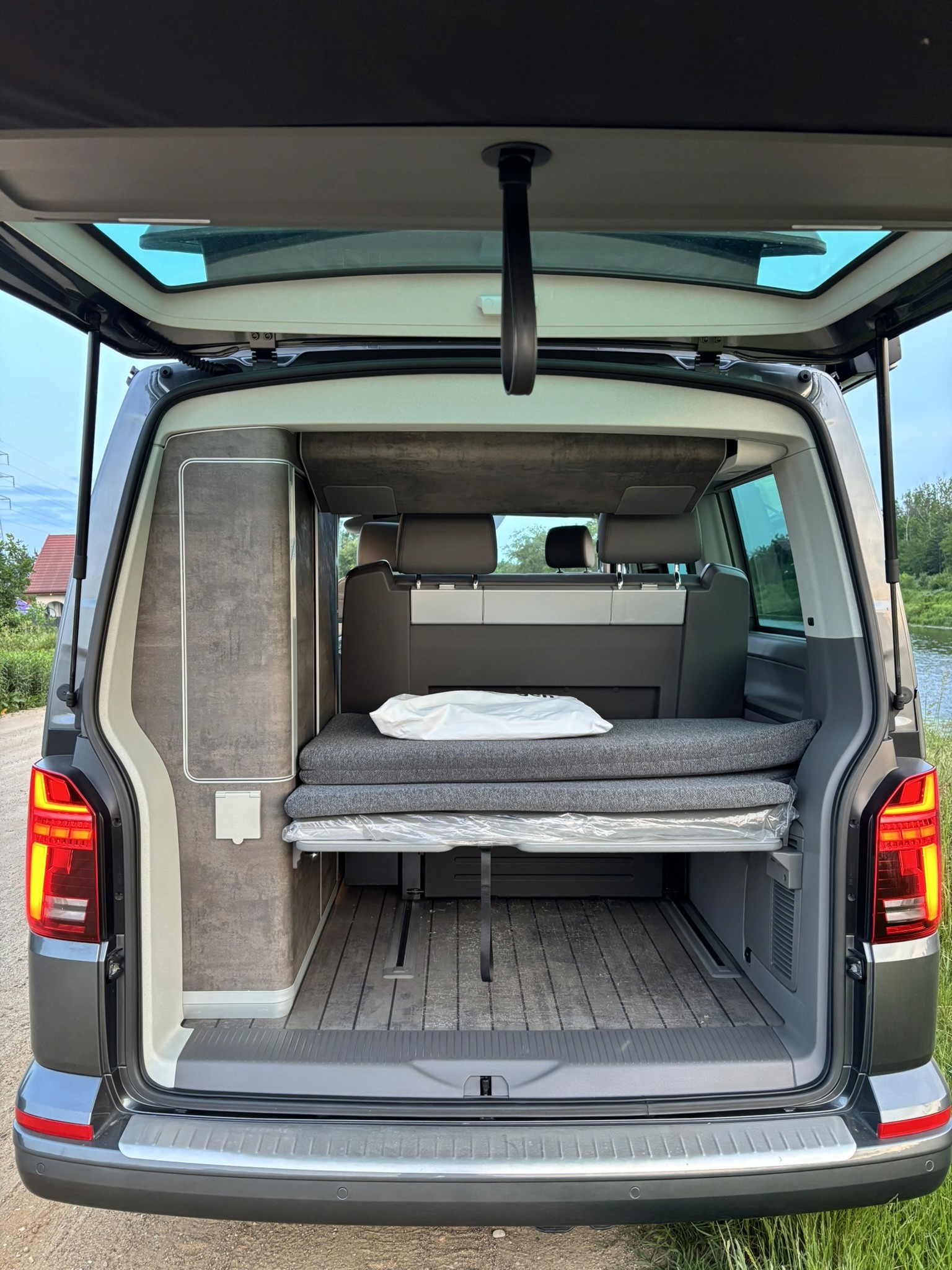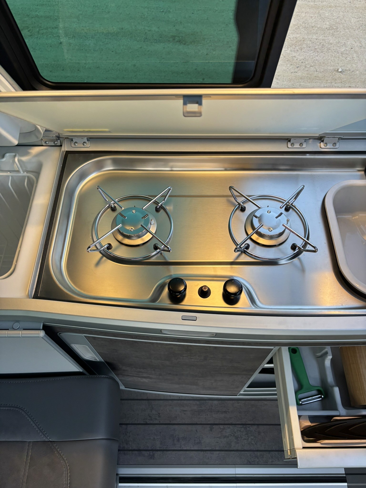 Wnętrze kampervana zostało zaprojektowane z myślą o maksymalnej wygodzie na niewielkiej powierzchni. Znajdziesz tu przestronny wysuwany dach z łóżkiem (2m x 1,2m), składane tylne siedzenie zamieniające się w drugie dwuosobowe łóżko (2m x 1,2m) oraz w pełni wyposażoną kuchnię i mnóstwo akcesoriów kempingowych: